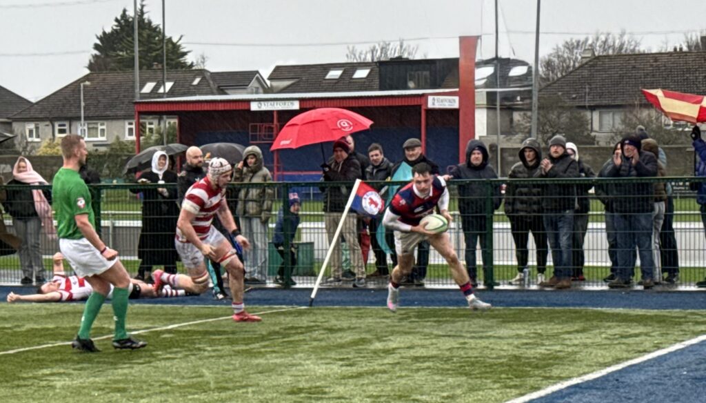 When the ball was finally released, it was nothing short of a miracle that they managed to move it across the line through numb hands where Alex O’Grady was well tackled by the Nenagh left winger. From the resulting ruck he was not be denied and scored when the ball was moved left again. Con Kelly added his fifth conversion, out of 5 efforts, which brought the score to 35 17.